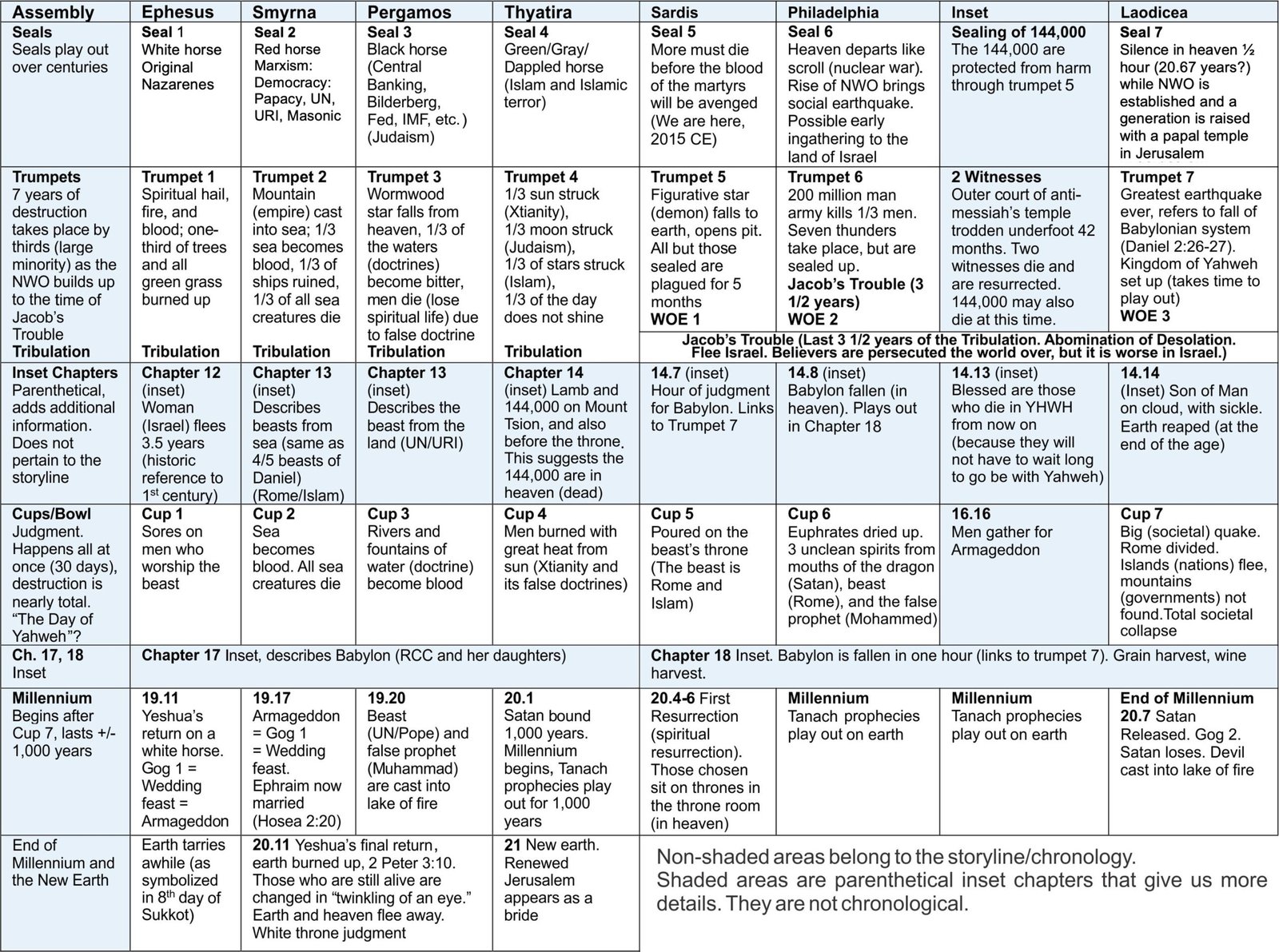 Most passages in Revelation belong to a chronological sequence of events, which we call the storyline. We show the storyline in white on the following charts.