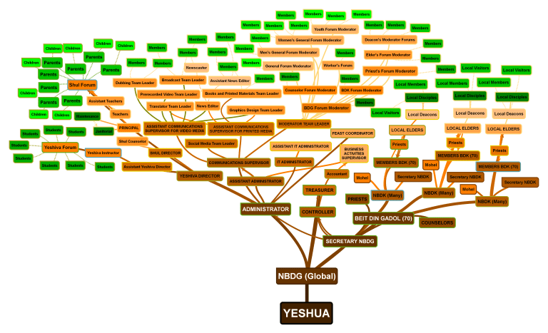 The priesthood is responsible for connecting all of the assemblies, and also for creating training and testing materials that benefit everyone, and also for certifying leadership. Because of this there is an administration section (on the left in the image above). The admin section publishes the doctrinal, training, and testing materials that serve the body as a whole, as directed by the Nasi of the Beit Din Gadol.