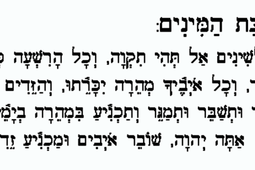 12 And for slanderers [l’malshinim] let there be no hope, and may all the evil in an instant be destroyed and all Thy enemies be cut down swiftly; and the evil ones uproot and break and destroy and humble soon in our days. Blessed are Thou, Adonai, who breaks down enemies and humbles sinners.