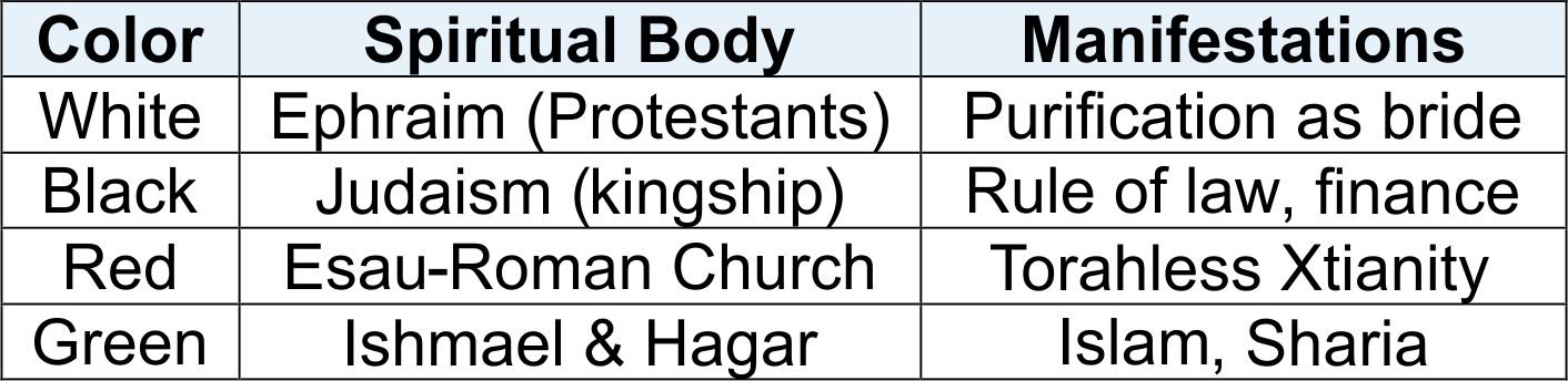 As we will see later, Ishmael is a covenant people, and the survivors of Ishmael will be brought into the covenant through Yeshua after Armageddon. Also in The Genesis 35 Alliance we will see Jews and Christians (black and white horses) teaming up to defend against a combined Roman Christian and Ishmaelite (red horse and green horse) foe. This will be the red and green horses (Esau and Ishmael) seeking to kill Jacob (Judah and Ephraim).