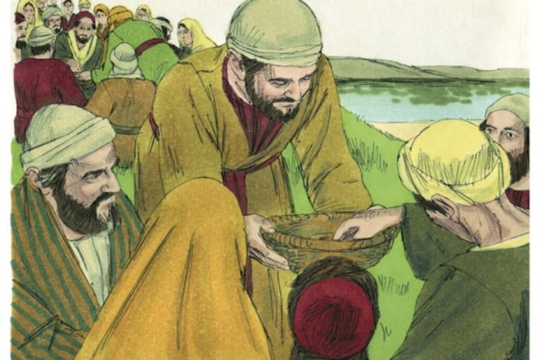About 5,000 people have come to see Yeshua. Many of them have probably walked for days. Yeshua has shown compassion by healing them and teaching them. Now He is performing a miracle to feed them all. Because He is training you to be a priest in His absence, He tells you to serve the people the bread He multiplies, and gather up all the fragments.